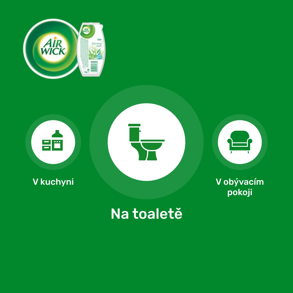 Vonný gel Air Wick s vůní ranní rosy. Svěží vůně ranní rosy pomáhá eliminovat pachy. Potlačuje pachy. Osvěžuje vzduch.