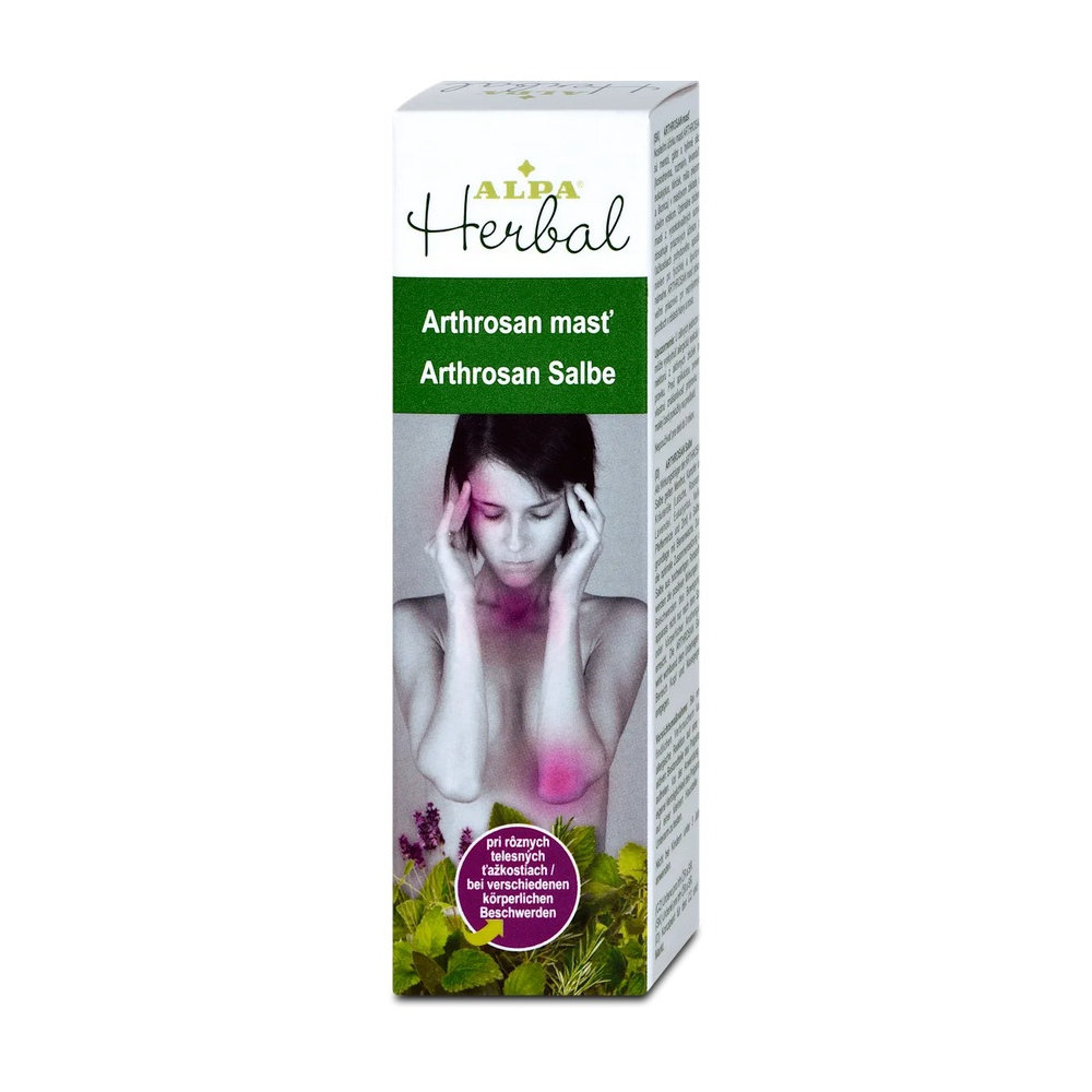 Alpa Herbal Arthrosan mast je bylinný přípravek určený pro úlevu při bolestech svalů, kloubů, šlach a páteře. Obsahuje mentol, kafr a směs přírodních silic, které podporují prokrvení pokožky, uvolnění napětí a přinášejí pocit osvěžení.