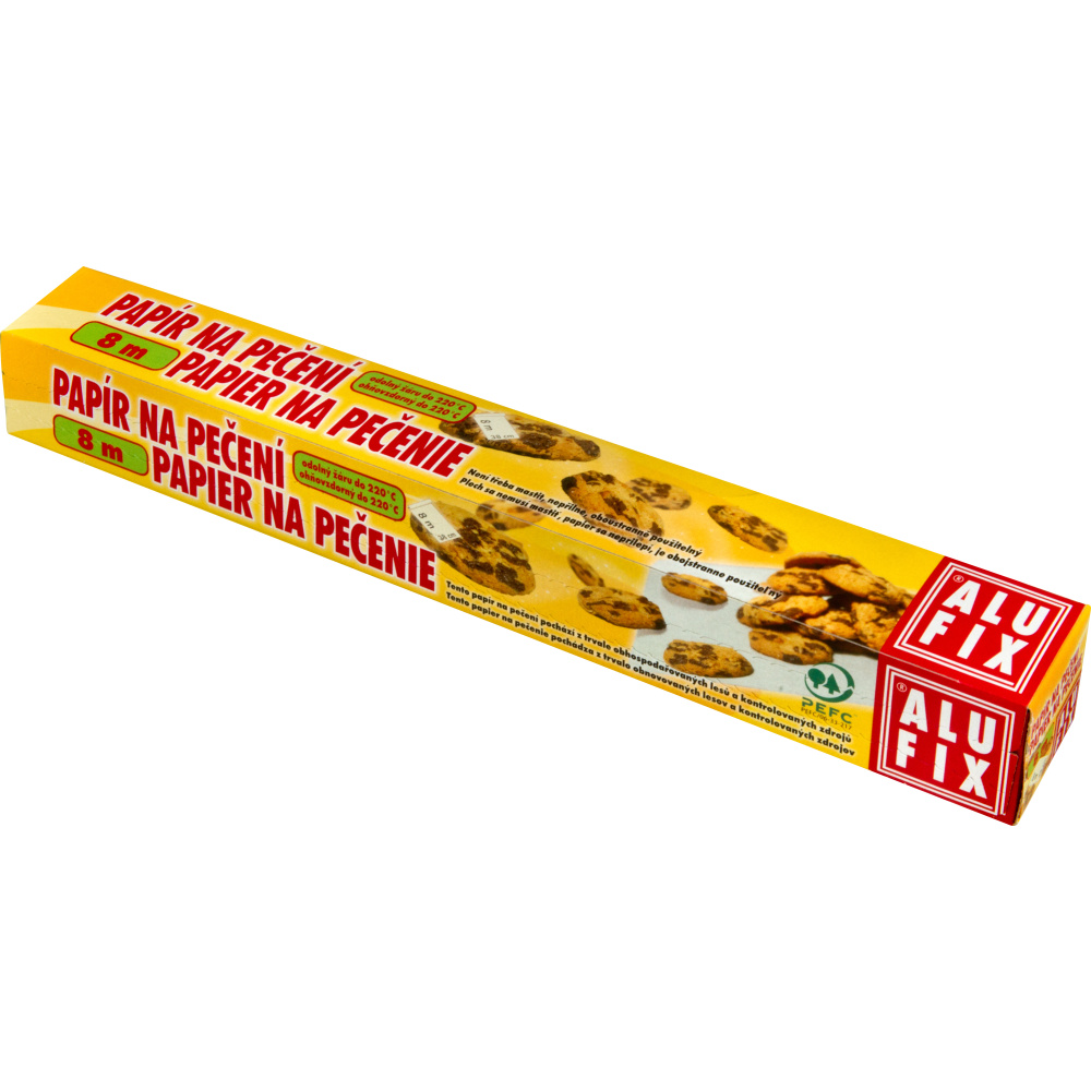 Papír na pečení o šířce 38 cm a délce 8 metrů, pečící papír je vhodný pro pečení různých pokrmů bez přidaných tuků. Papír na pečení Alufix je ideální pod pečivo, pizzu, koláče, štrúdl, rybí prsty, hranolky a jiné předsmažené potraviny.