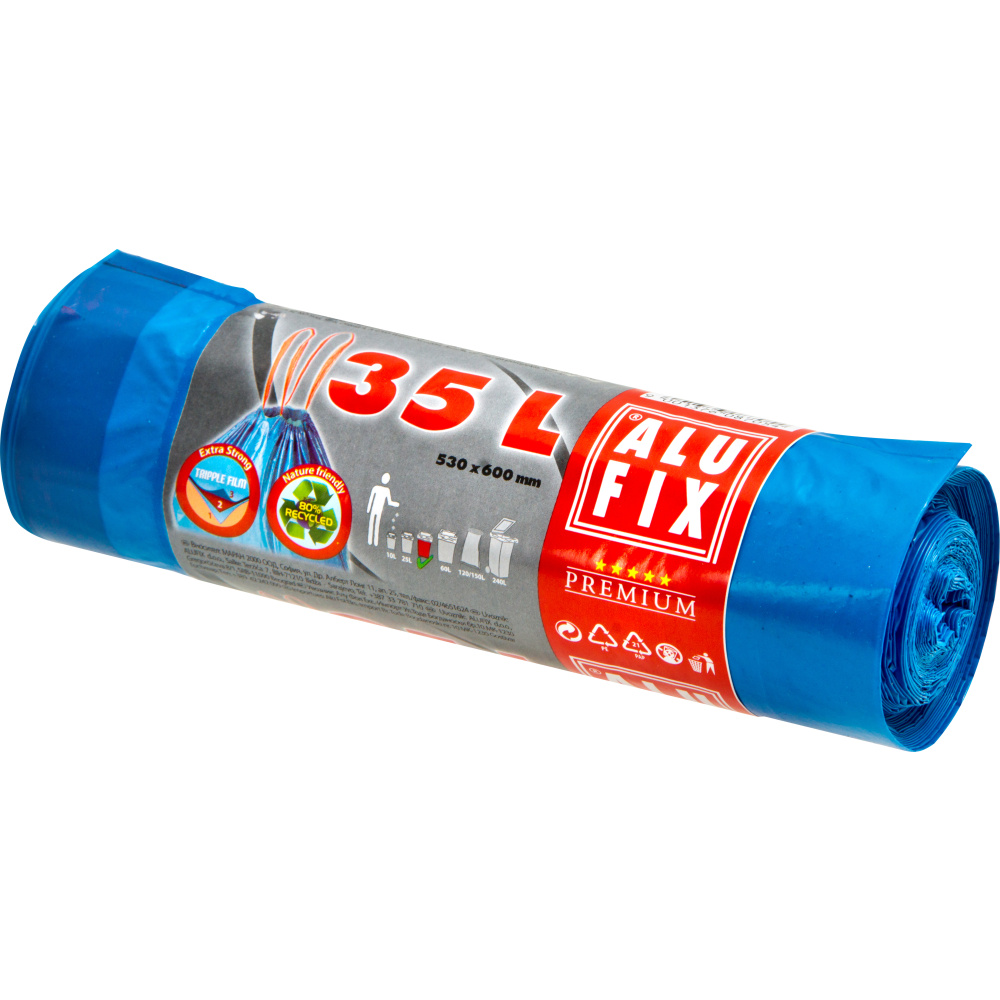 Alufix Premium pytle na odpadky zatahovací, objem 35 l, balení obsahuje 15 kusů, rozměr pytle 53 x 60 cm, HDPE modré. Pytle můžete používat na odpad nejen ve vaší domácnosti, ale také ve firmách, prodejnách atd.