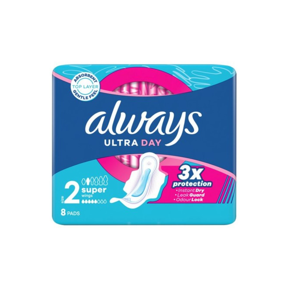 Always Ultra Day Super jsou extra savé dámské hygienické vložky s křidélky, které poskytují spolehlivou ochranu během silnějších menstruačních dní.