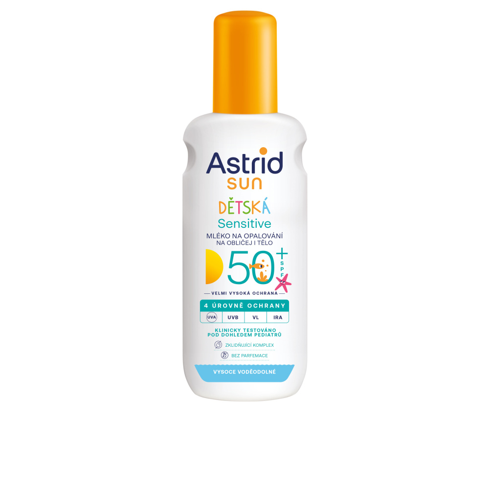 Astrid Sun Kids OF 50+ je opalovací mléko ve spreji s velmi vysokou ochranou, vyvinuté speciálně pro citlivou dětskou pokožku od 3 let.