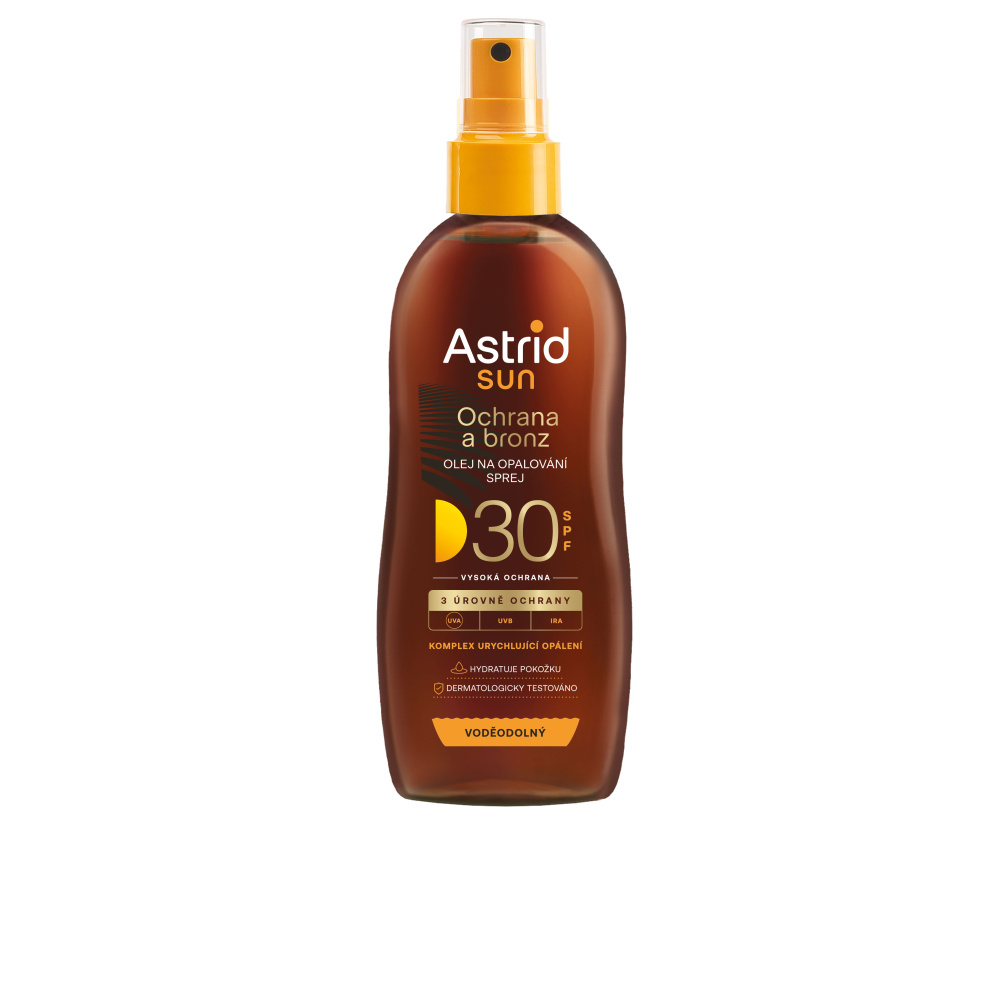 Astrid Sun olej na opalování ve spreji s ochranným faktorem SPF 30 poskytuje vysokou ochranu proti škodlivému UVA a UVB záření a zároveň pečuje o pokožku.