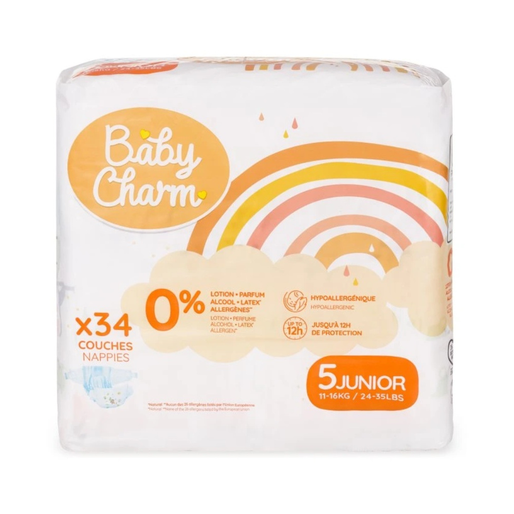 Jednorázové plenky Baby Charm Super Dry Flex ve velikosti Junior jsou určené pro děti s hmotností 11–16 kg.