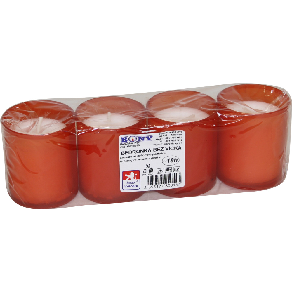 Svíčka BEDRONKA určena na hřbitovy v plastovém červeném obalu. Balena po 4 kusech ve folii.