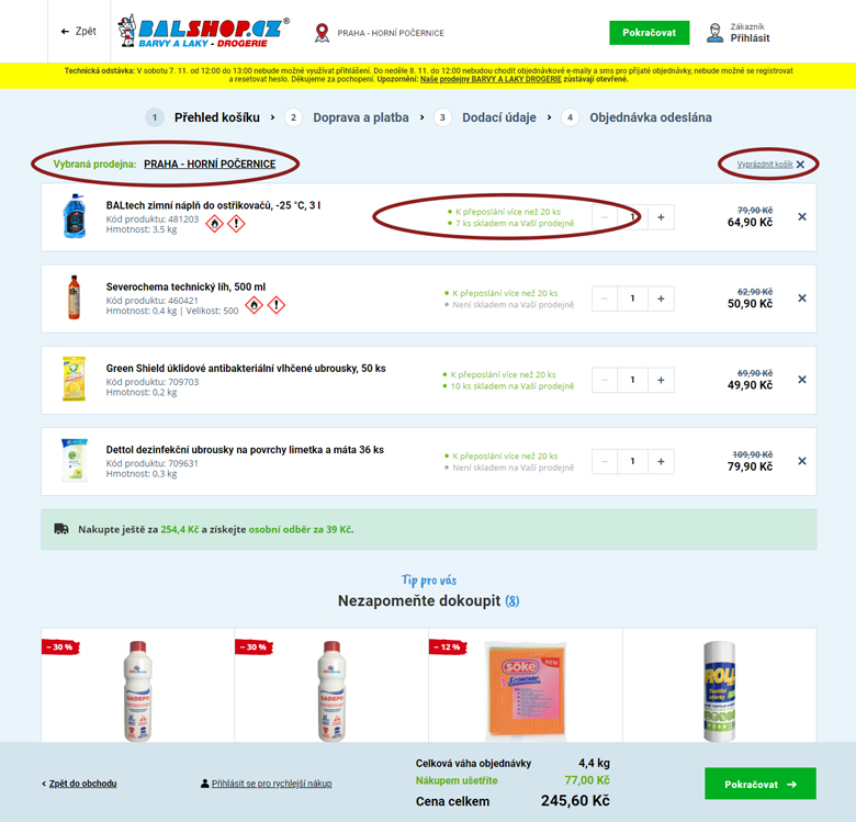 V případě, že si předvyberete prodejnu, čekají na Vás také úpravy v košíku. Nově můžete vymazat vše co v košíku máte jedním tlačítkem a i zde uvidíte dostupnost na své prodejně.
