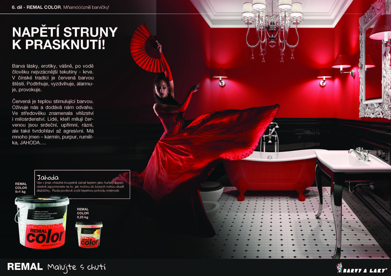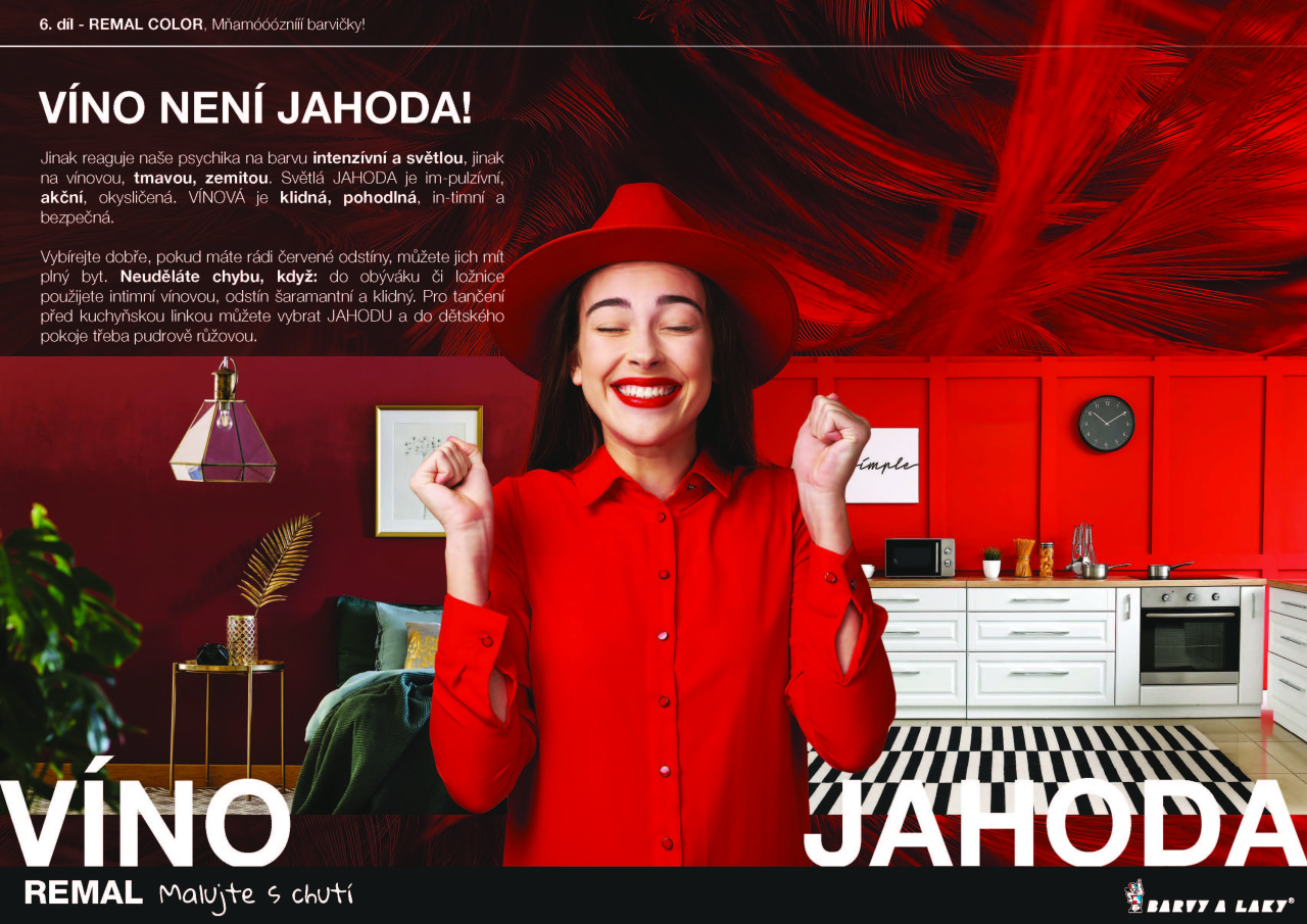 Jinak reaguje naše psychika na barvu intenzívní a světlou, jinak na vínovou, tmavou, zemitou. Světlá JAHODA je impulzívní, akční, okysličená. VÍNOVÁ je klidná, pohodlná, intimní a bezpečná. Vybírejte dobře, pokud máte rádi červené odstíny, můžete jich mít plný byt. Neuděláte chybu, když: do obýváku či ložnice použijete intimní vínovou, odstín šaramantní a klidný. Pro tančení před kuchyňskou linkou můžete vybrat JAHODU a do dětského pokoje třeba pudrově růžovou.