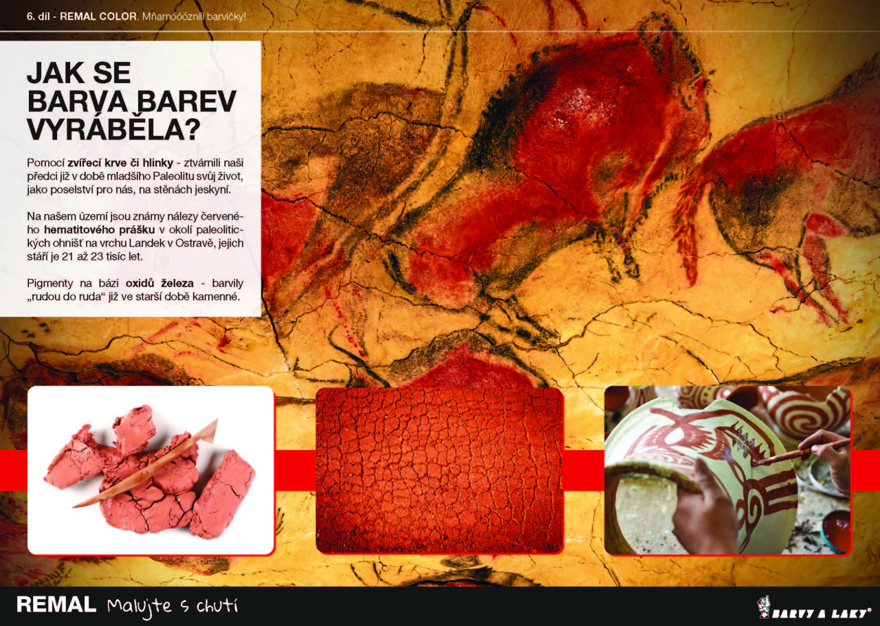 Pomocí zvířecí krve či hlinky - ztvárnili naši předci již v době mladšího Paleolitu svůj život, jako poselství pro nás, na stěnách jeskyní. Na našem území jsou známy nálezy červeného hematitového prášku v okolí paleolitických ohnišť na vrchu Landek v Ostravě, jejich stáří je 21 až 23 tisíc let.