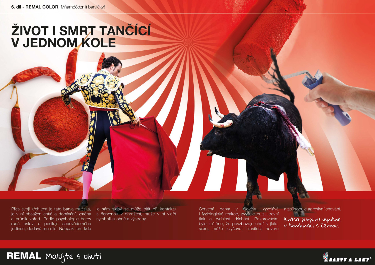 Šťavnatá a energická, věčně v pohybu, burcující vášnivá, to je červená, barva zvyšující váš tep, vytváří atmosféru očekávání. Barva lásky, erotiky, vášně, po vodě člověku nejvzácnější tekutiny - krve. V čínské tradici je červená barvou štěstí. Podtrhuje, vyzdvihuje, alarmuje, provokuje. Červená je teplou stimulující barvou. Oživuje nás a dodává nám odvahu. Ve středověku znamenala vítězství i milosrdenství. Lidé, kteří milují červenou jsou srdeční, upřímní, rázní, ale také tvrdohlaví až agresívní. Má mnoho jmen – karmín, purpur, rumělka, JAHODA….