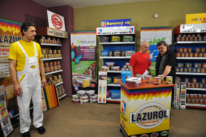 Vystavené výrobky (na stolku): Barlet Penetrace, Barlet Akrylát Standard, Barlet Akrylát Standard Plus, Barlet Akrylát Standard s plnivem, Remal Telsal, Barlet Fasádní barva Silikon, Barlet pastovitá omítka Akrylát, Barlet pastovitá omítka Silikon