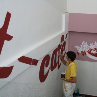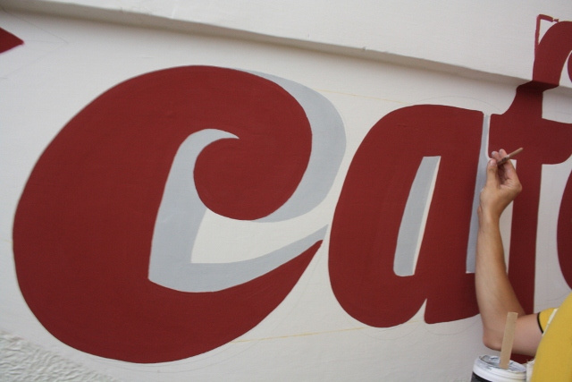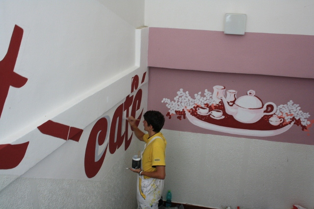 Tento 10m dlouhý nápis s dekorací, který bude lákat kolemjdoucí k návštěvě kavárny, je prezentací kvality našich barev v praxi.