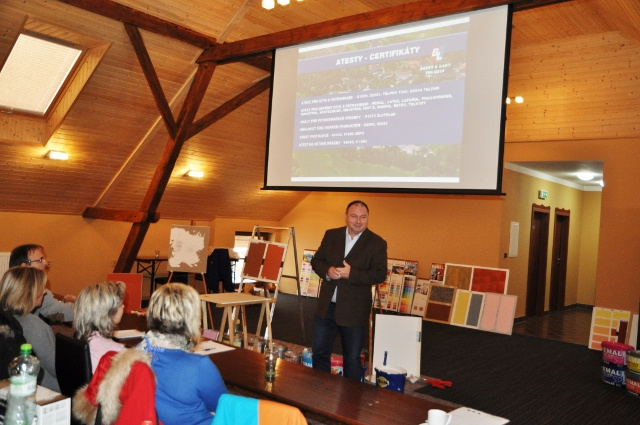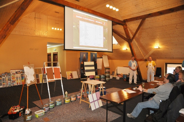 Zde byly prezentovány změny v sortimentu, nové složení výrobků či vlastnosti novinek pro letošní rok. Zároveň jsme představili novou výrobní halu, která je určena pro výrobu vodou ředitelných barev přímo v areálu firmy BARVY A LAKY TELURIA Skrchov a jejíž výstavba bude dokončena v tomto roce. Prezentace se dotkla také atestů a certifikátů k výrobkům. Technický servis BARVY A LAKY TELURIA, s.r.o. přispěl svou částí praktických ukázek. Generální ředitel, pan Dariusz Jakubowicz pronesl krátký projev, ve kterém vyjádřil svůj dík partnerům i zaměstnancům za dosavadní spolupráci a popřál všem hodně úspěchů v novém roce.