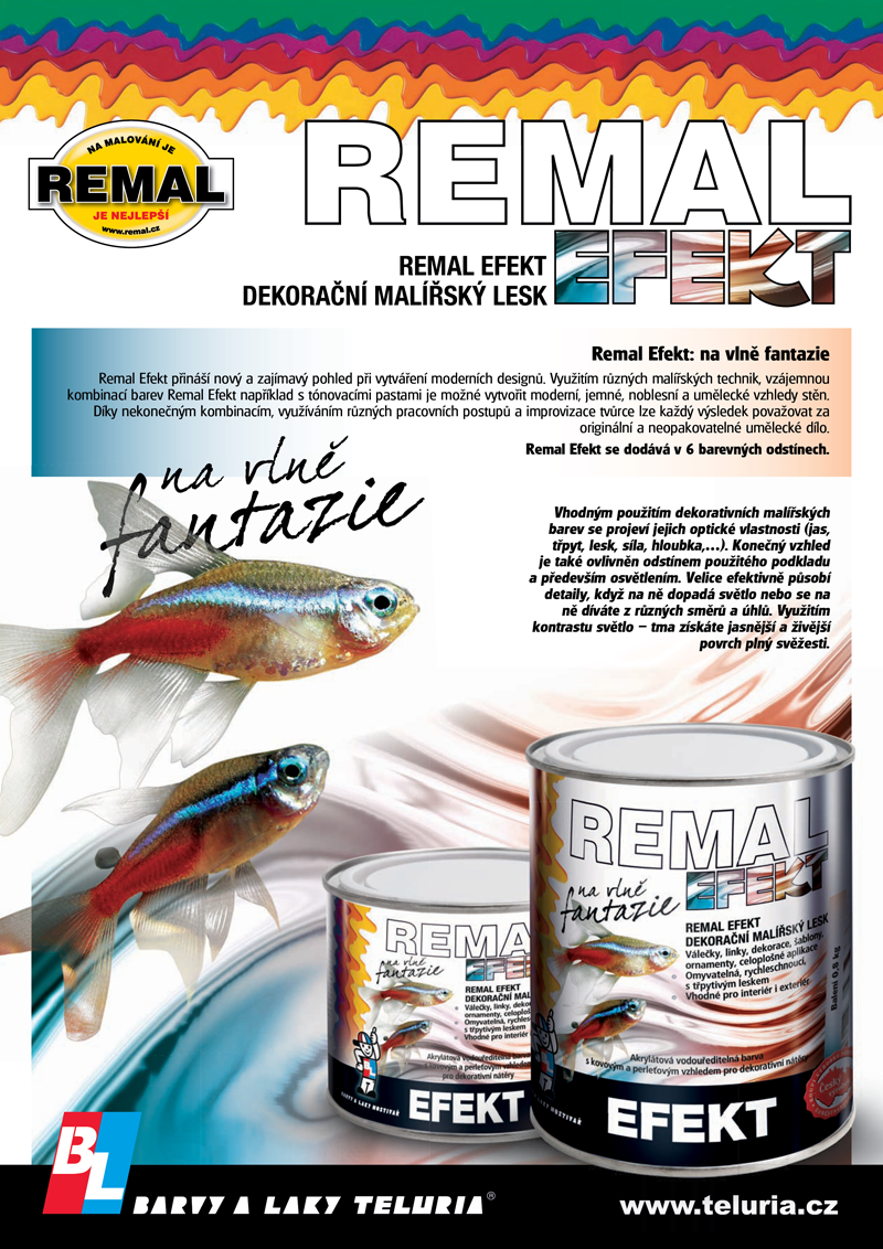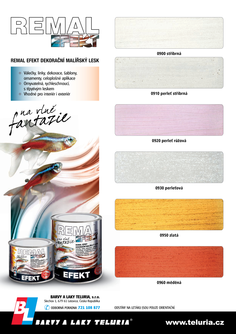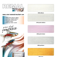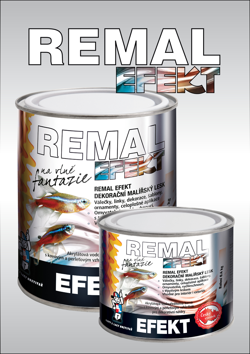 Jedná se o šest vodou ředitelných a omyvatelných barev – lesk zlatý, stříbrný, měděný, perleťový, perleť stříbrnou a perleť růžovou.  Jejich největší uplatnění se nachází v interiéru, ale pro krátkodobé aplikace je lze využít také v exteriéru. Práce s barvami REMAL EFEKT je snadná a v krátké době lze s nimi vytvořit originální a jedinečný vzhled plný energie a života.