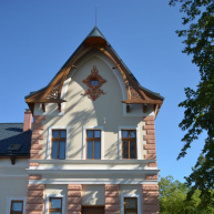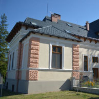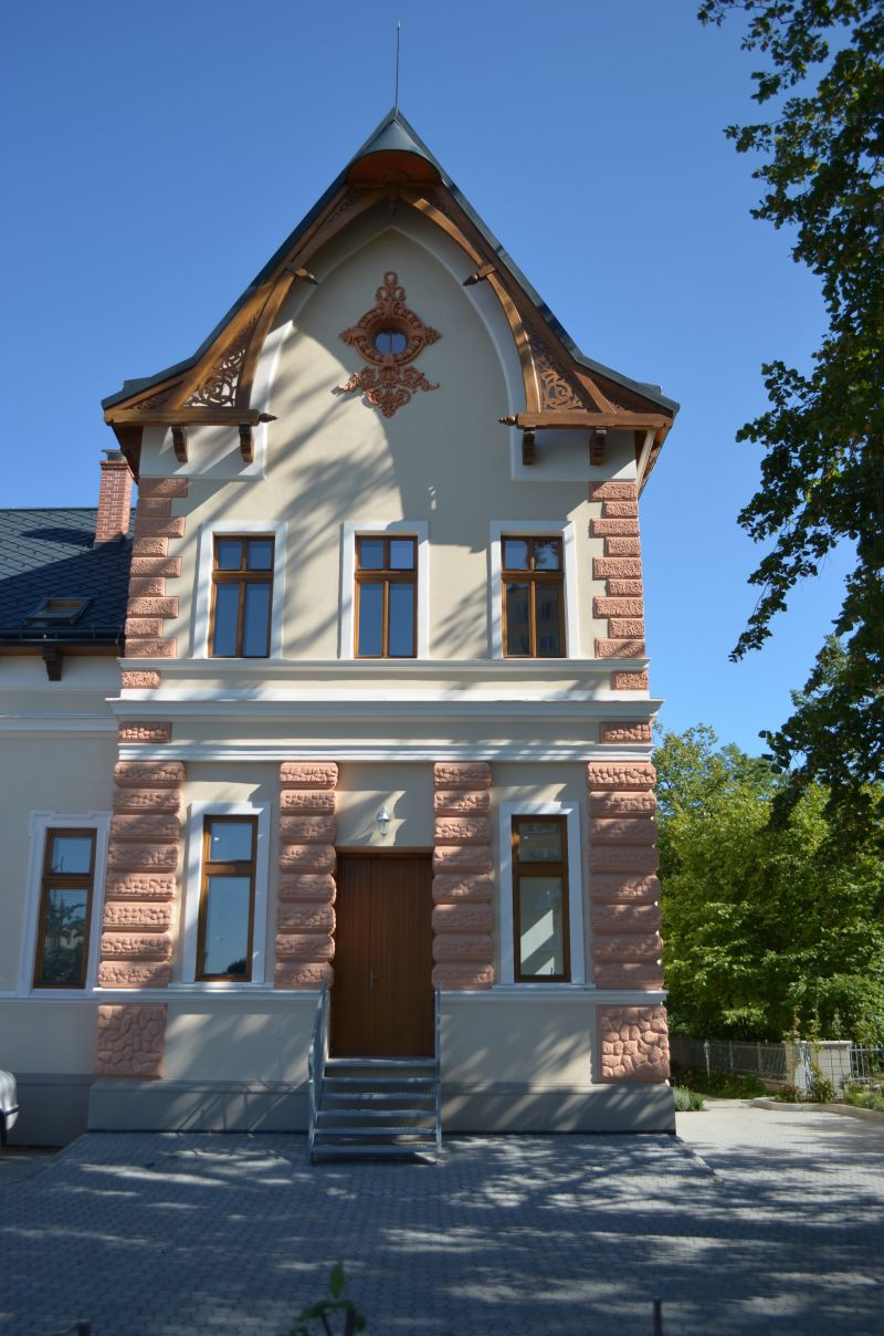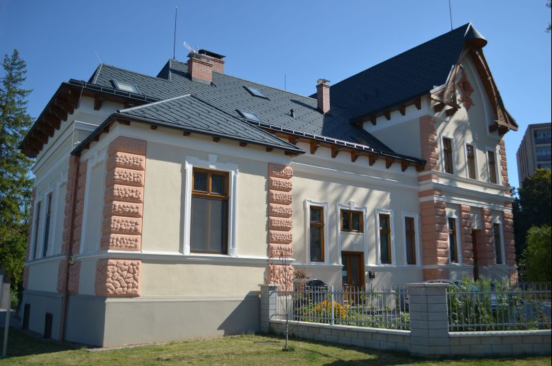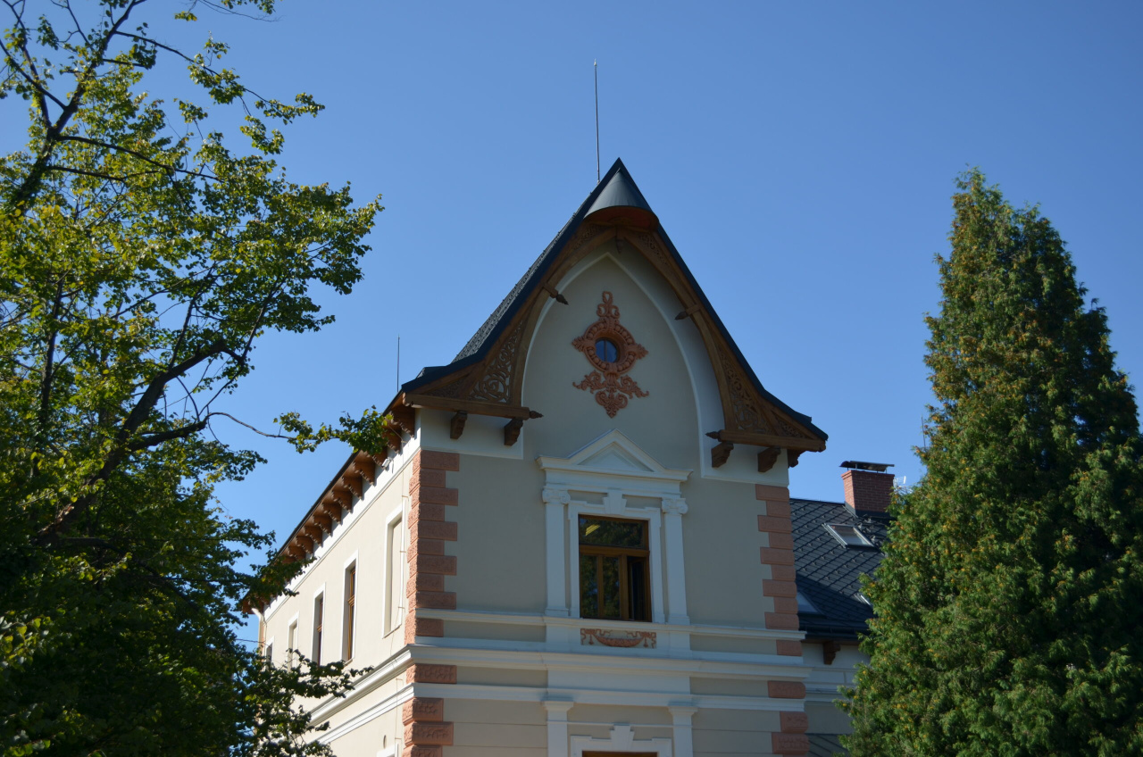 Rekonstrukce Vily Machů v Kopřivnici ve Štefánikové ulici č. 47 – použitý materiál: fasádní barva BARLET SILIKÁT FASÁDNÍ BARVA, nátěr kovových prvků TELPUR S 210.