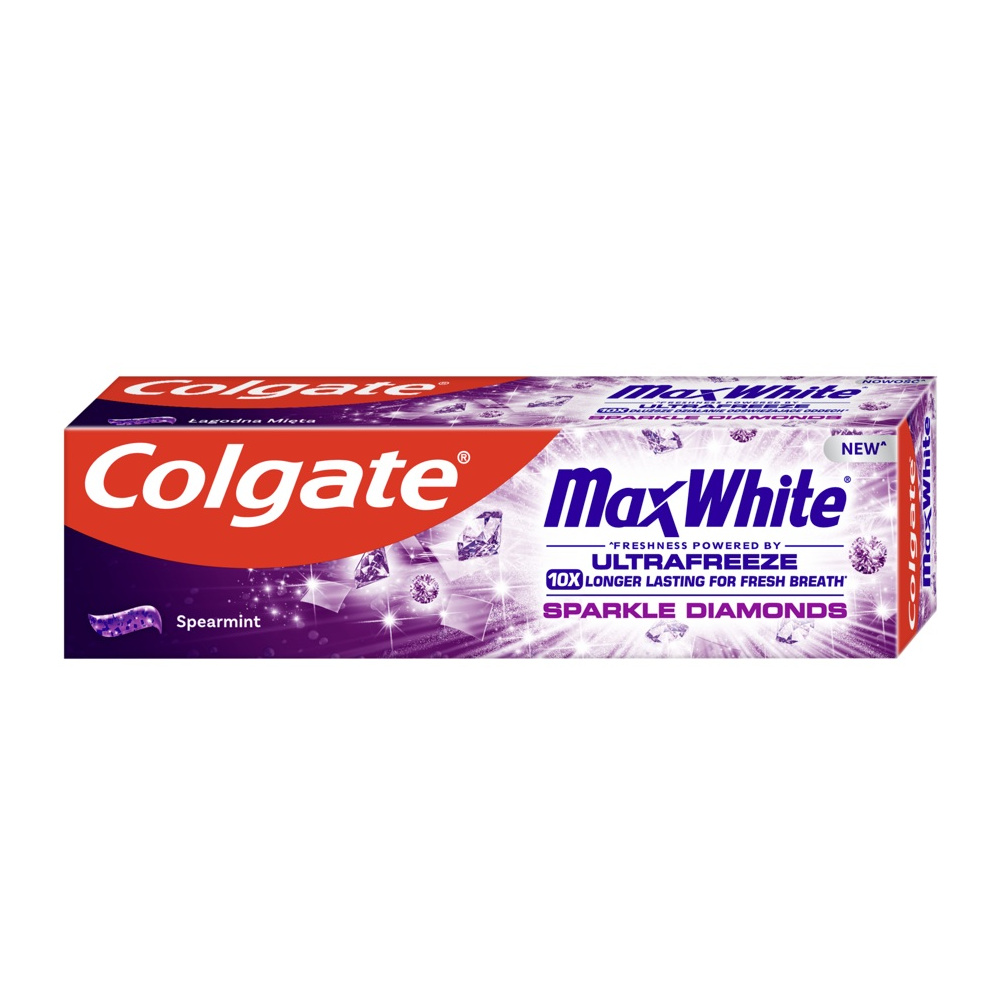 Colgate zubní pasta Max White Sparkle Diamonds rozjasní vaši sklovinu. Bělící zubní pasta s technologií FreshFX také poskytuje dlouhotrvající chladivý účinek a odstraňuje nežádoucí pigmentaci zubů. Více informací