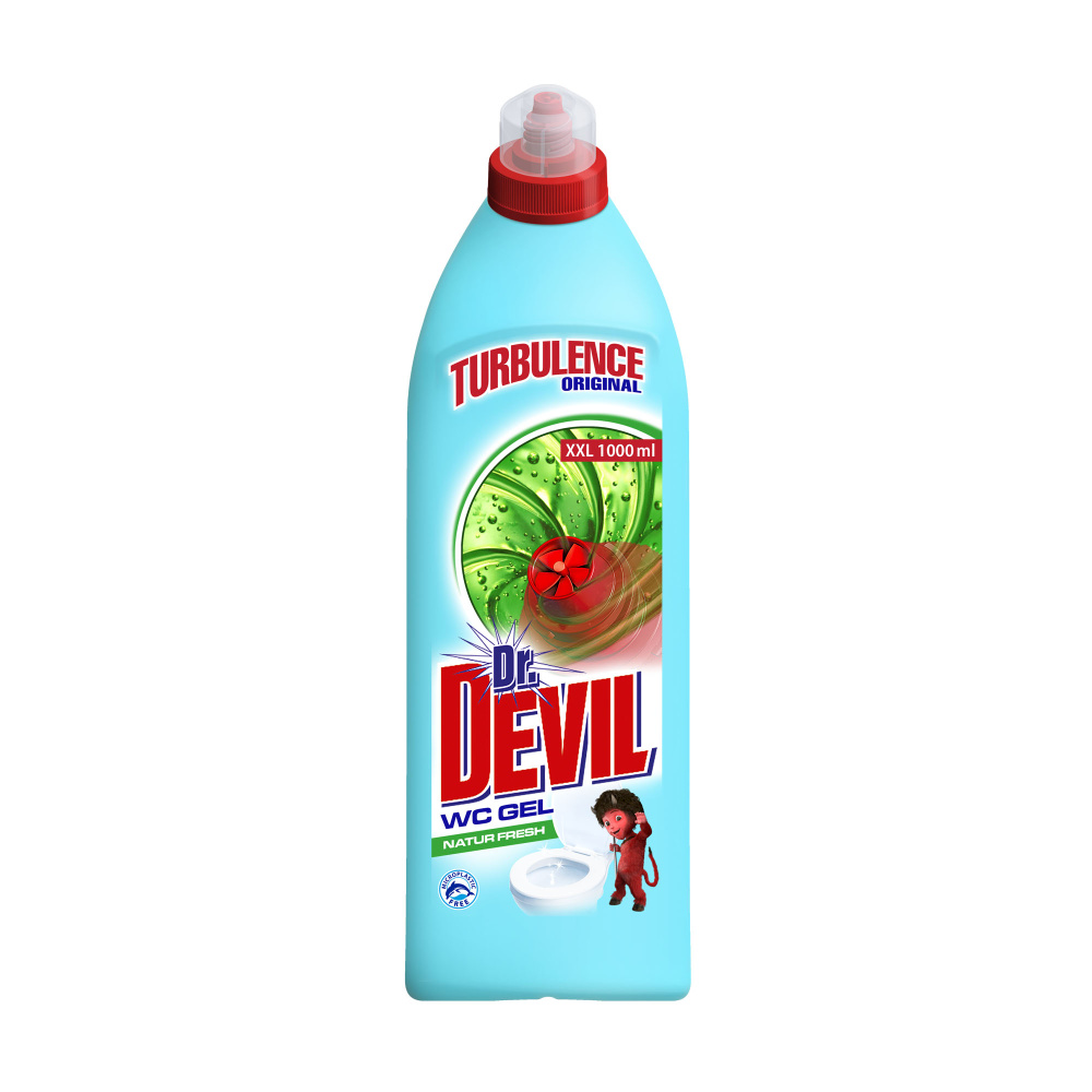 Dr. DEVIL WC Gel Turbulence Natur Fresh je účinný čisticí prostředek pro toalety, který díky své gelové konzistenci účinně odstraňuje nečistoty a vodní kámen, přičemž zanechává svěží přírodní vůni.