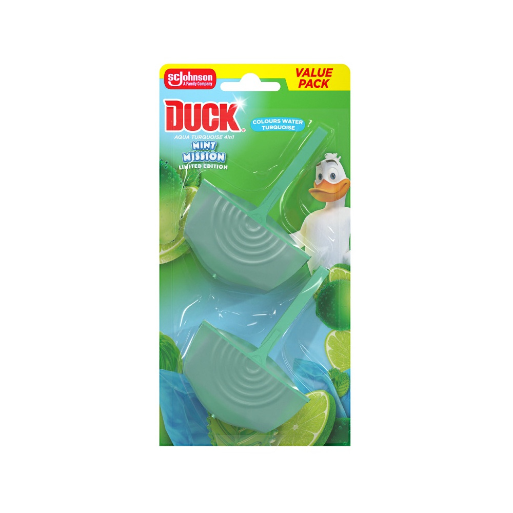 Duck Aqua 4in1 Turquoise Mint Mission je závěsný WC blok, který zajišťuje komplexní hygienu toalety při každém spláchnutí. Čistí toaletu, pomáhá proti vodnímu kameni, vytváří aktivní pěnu a zanechává svěží vůni máty s citrusovými tóny.