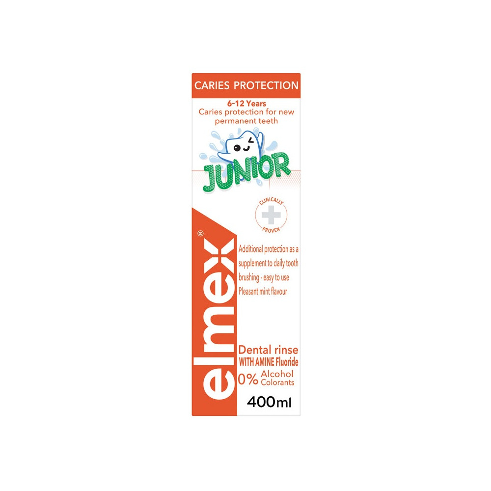 Elmex ústní voda Junior je určena pro každodenní péči o zuby dětí ve školním věku. Pomáhá doplnit běžnou ústní hygienu a zanechává v ústech příjemný pocit svěžesti.
