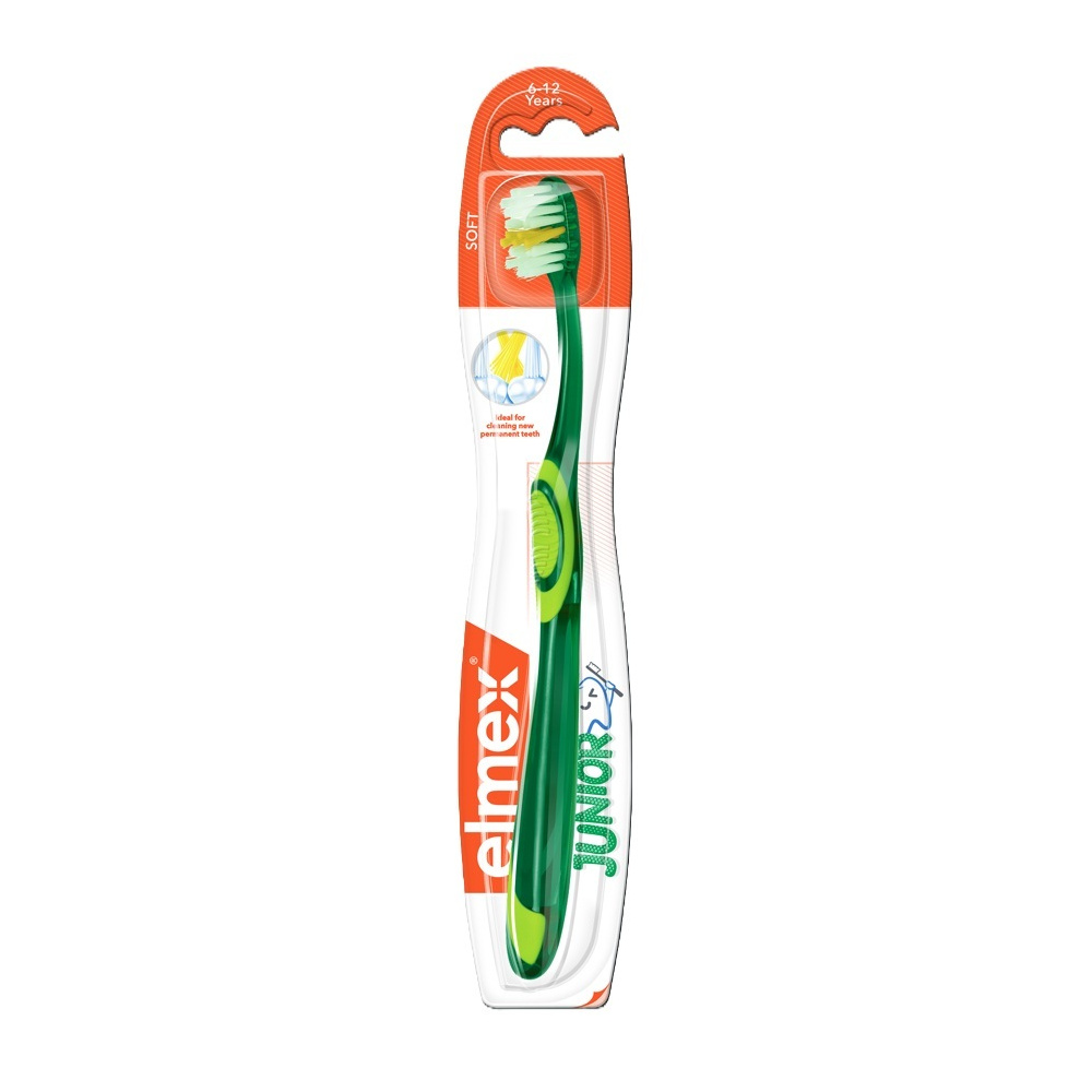Elmex Junior měkký zubní kartáček je speciálně upraven pro potřeby čištění zubů v období smíšeného chrupu. Velikost hlavičky kartáčku ulehčuje čištění právě prořezávajících se stoliček a prodloužená X-vlákna proniknou i do mezizubních prostor.
