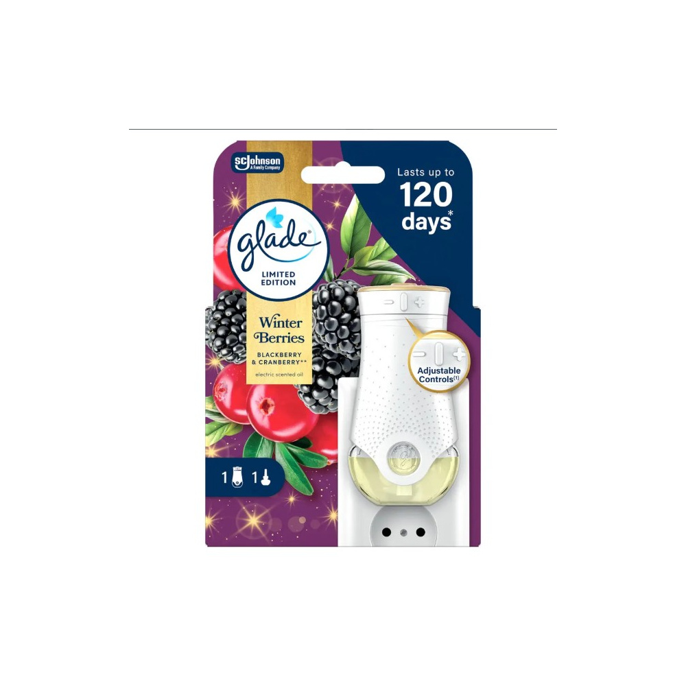Kompletní sada Glade Electric Winter Berries – elektrický osvěžovač vzduchu se strojkem a náplní 20 ml. Přináší do vašeho domova dlouhotrvající vůni zimních bobulí a lesního ovoce.
