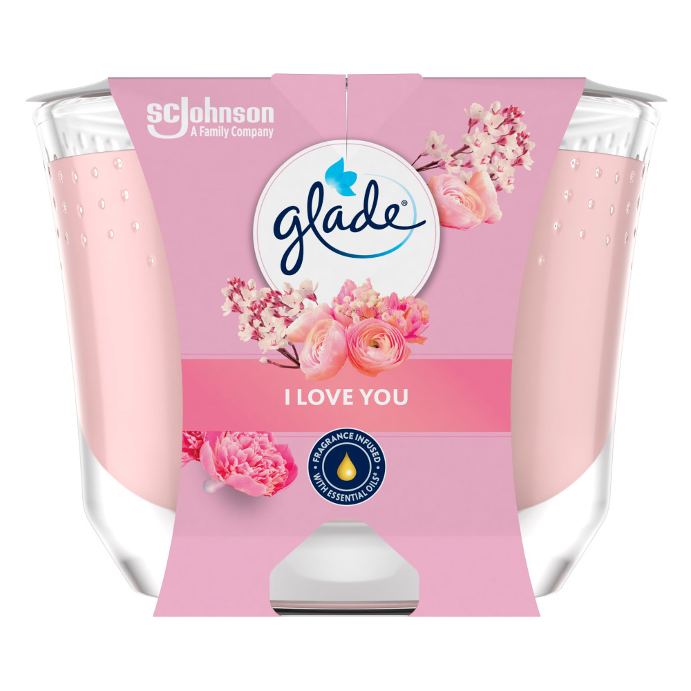 Vonná svíčka Glade I Love You se svěží vůní. Obsahuje esenciální oleje.