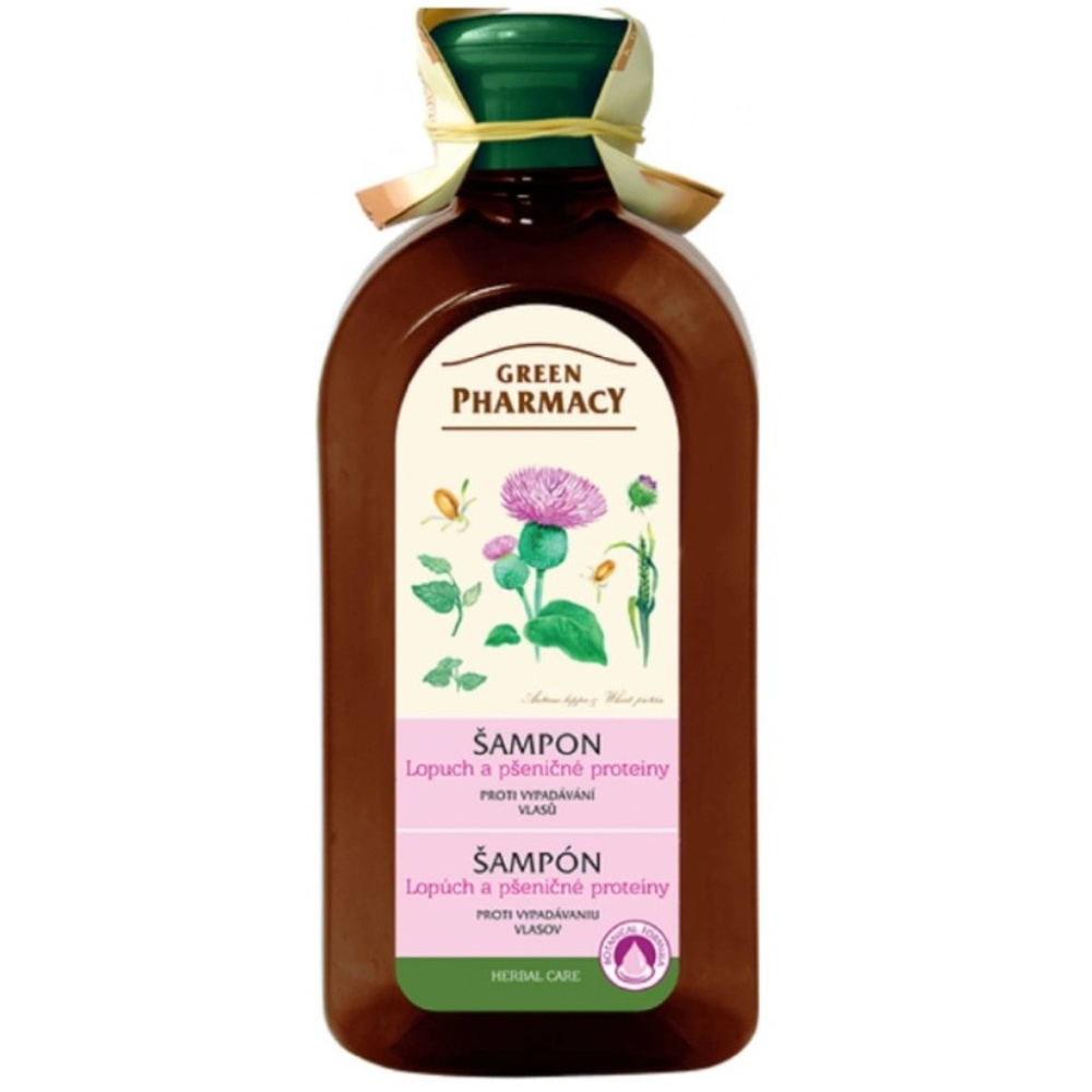 Green Pharmacy šampon proti vypadávání vlasů s lopuchem a pšenicí je určen pro jemné, ale účinné mytí vlasů se speciálním účinkem na posílení vlasových kořínků a snížení nadměrného vypadávání vlasů.