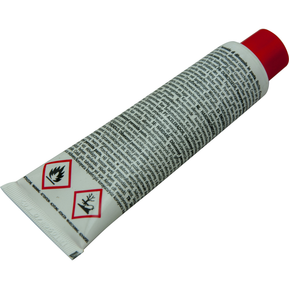 DBPO pasta - červený PE iniciátor - tužidlo do polyesterových tmelů. Reakční iniciátor pro vytvrzení polyesterových tmelů. Tužidlo do polyesterových tmelů, tužidlo do akrylových plničů, tužidlo do klarlaku, tužidlo do akrylových barev.
