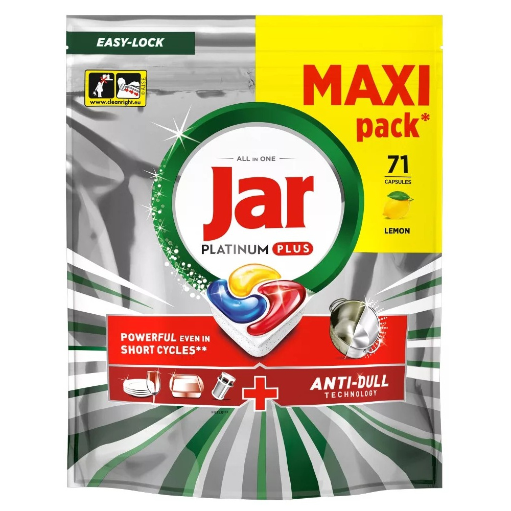 Jar Platinum Plus tablety do myčky pomáhají odstranit běžné nečistoty z nádobí při mytí v myčce. Předem odměřená kapsle usnadňuje dávkování mycího prostředku.