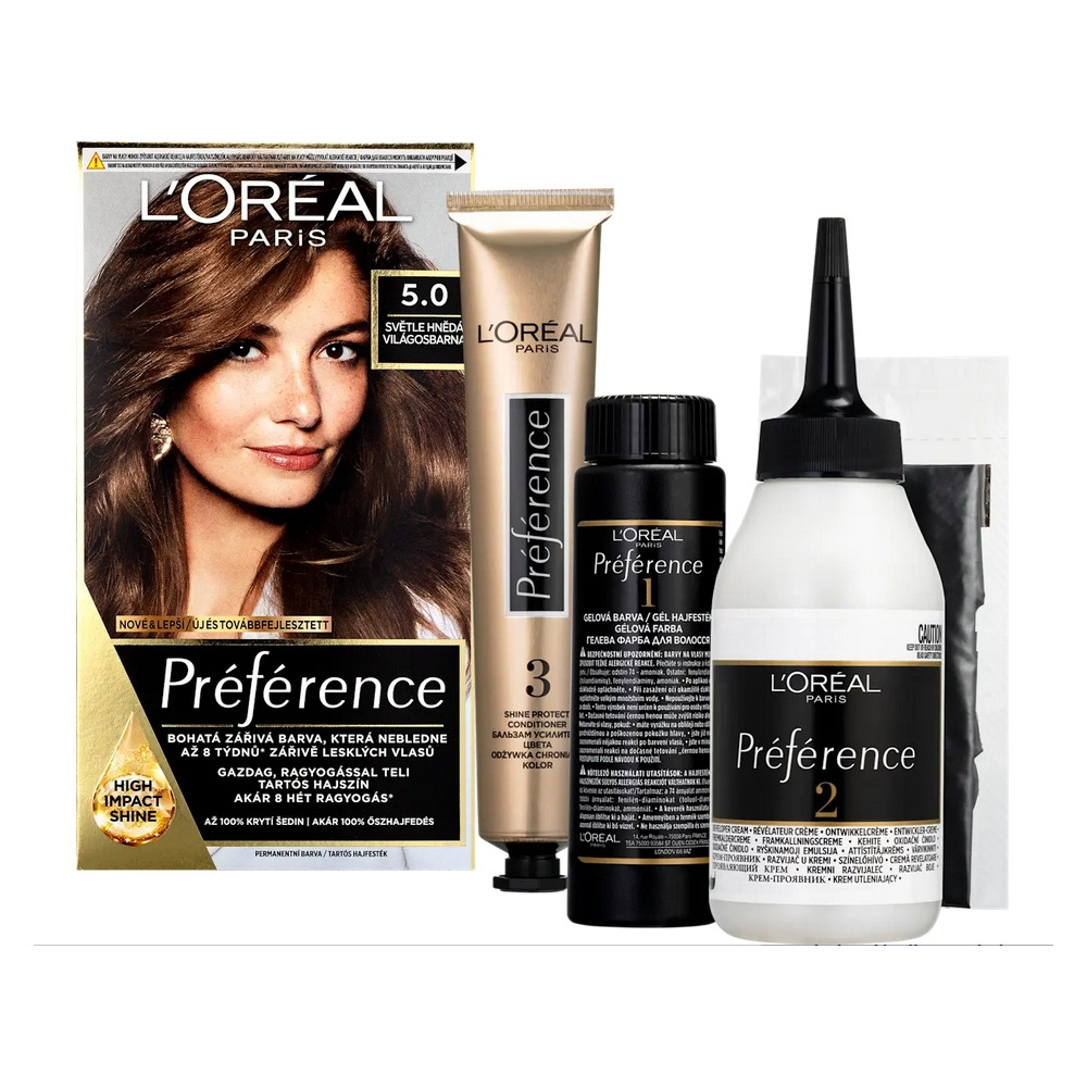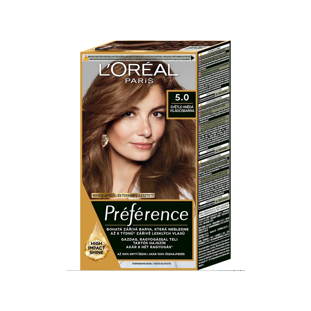 L’Oréal Paris Préférence 5.0 Světle hnědá je permanentní barva na vlasy s bohatým, zářivým světle hnědým odstínem a dlouhotrvajícím leskem.
