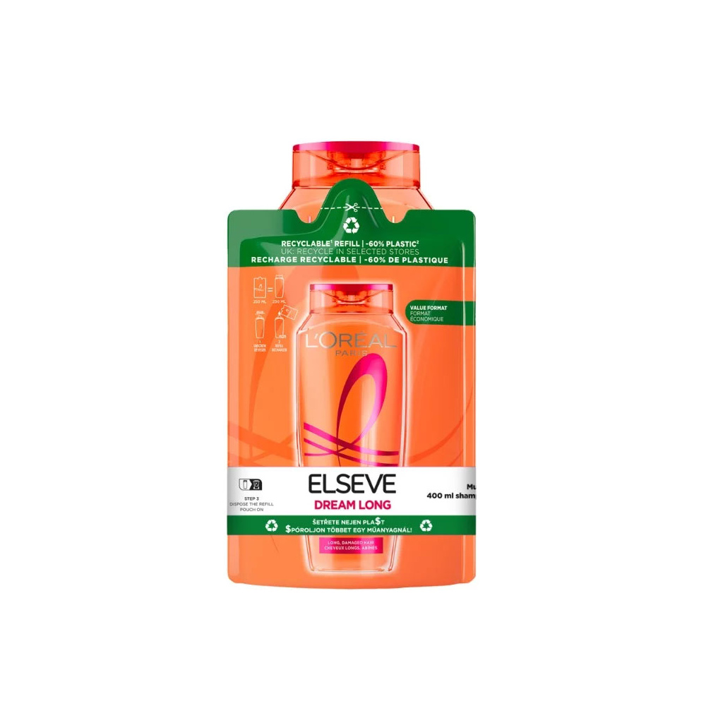 Objevte duopack L'Oréal Paris Elseve Dream Long: šampon 400 ml a ekologická náhradní náplň 250 ml. Regenerujte a posilněte své dlouhé vlasy díky jedinečnému složení s rostlinným keratinem a ricinovým olejem.