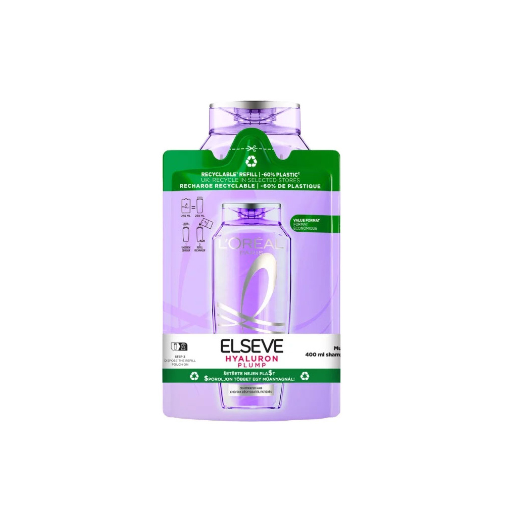 Objevte duopack L'Oréal Paris Elseve Hyaluron Plump: šampon 400 ml a ekologická náhradní náplň 250 ml. Hydratujte své vlasy až na 72 hodin díky kyselině hyaluronové pro lesklé a revitalizované vlasy bez zatížení.