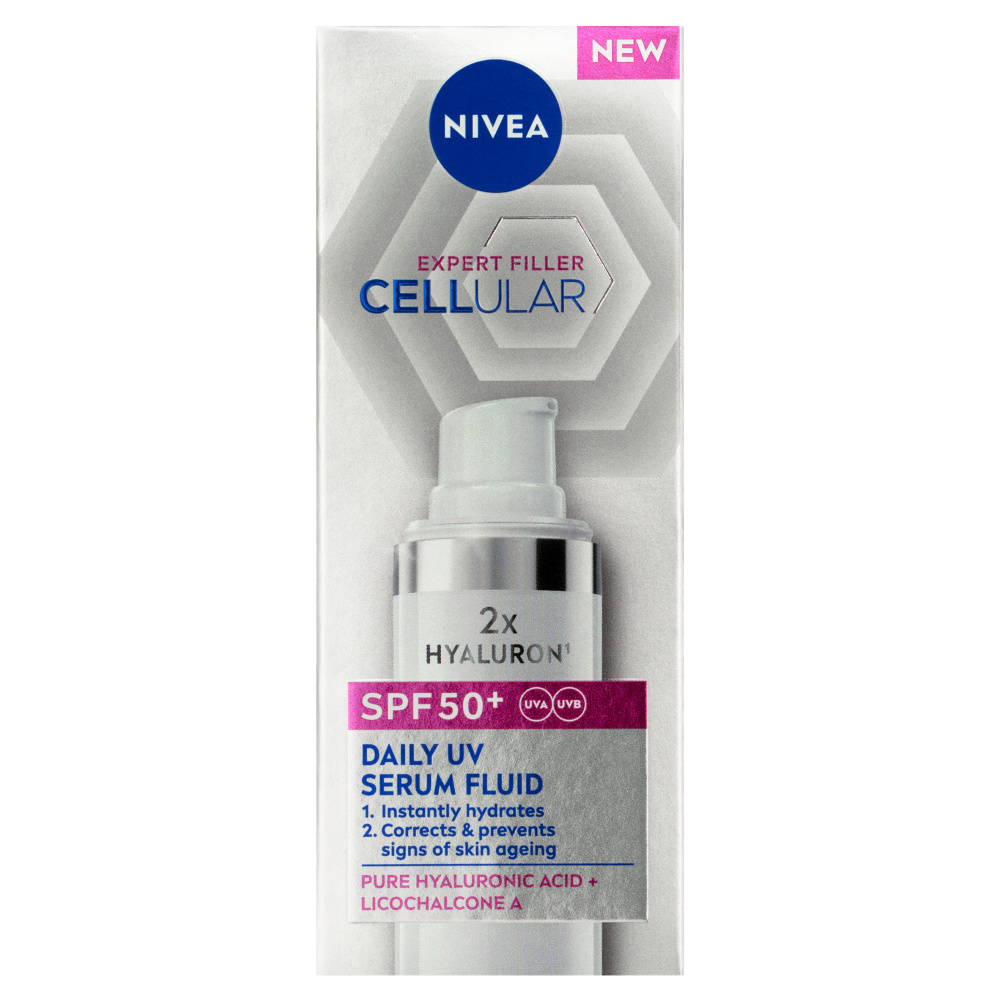Denní UV Sérum Fluid Cellular Expert Filler OF 50+ je efektivním řešením pro každodenní ochranu pleti proti UV záření a redukci známek stárnutí pleti. Účinné složení obsahuje 2 typy čisté kyseliny hyaluronové pro podporu vlastní tvorby hyaluronu v pl