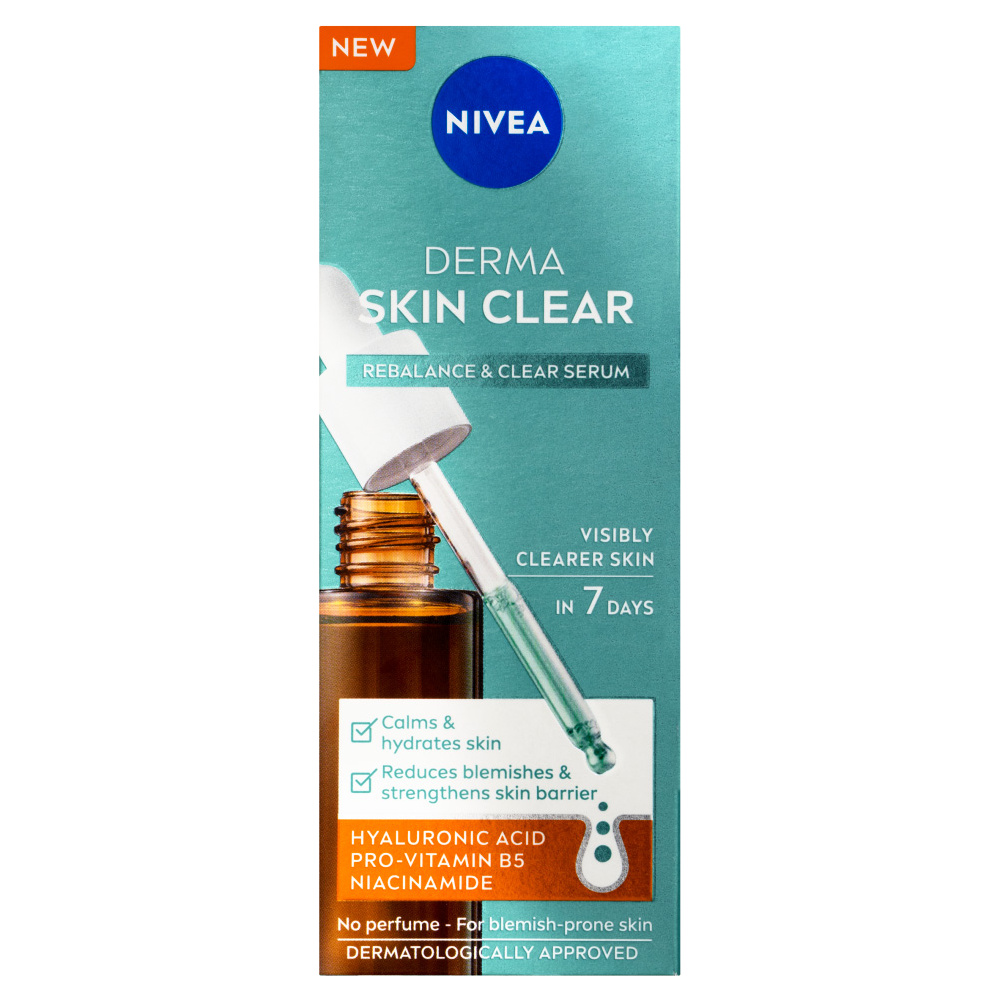 Nivea Derma Skin Clear sérum Rebalance & Clear s kyselinou hyaluronovou, provitamínem B5 a niacinamidem je speciálně vyvinuto pro podrážděnou a namáhanou pleť se sklonem k nedokonalostem.