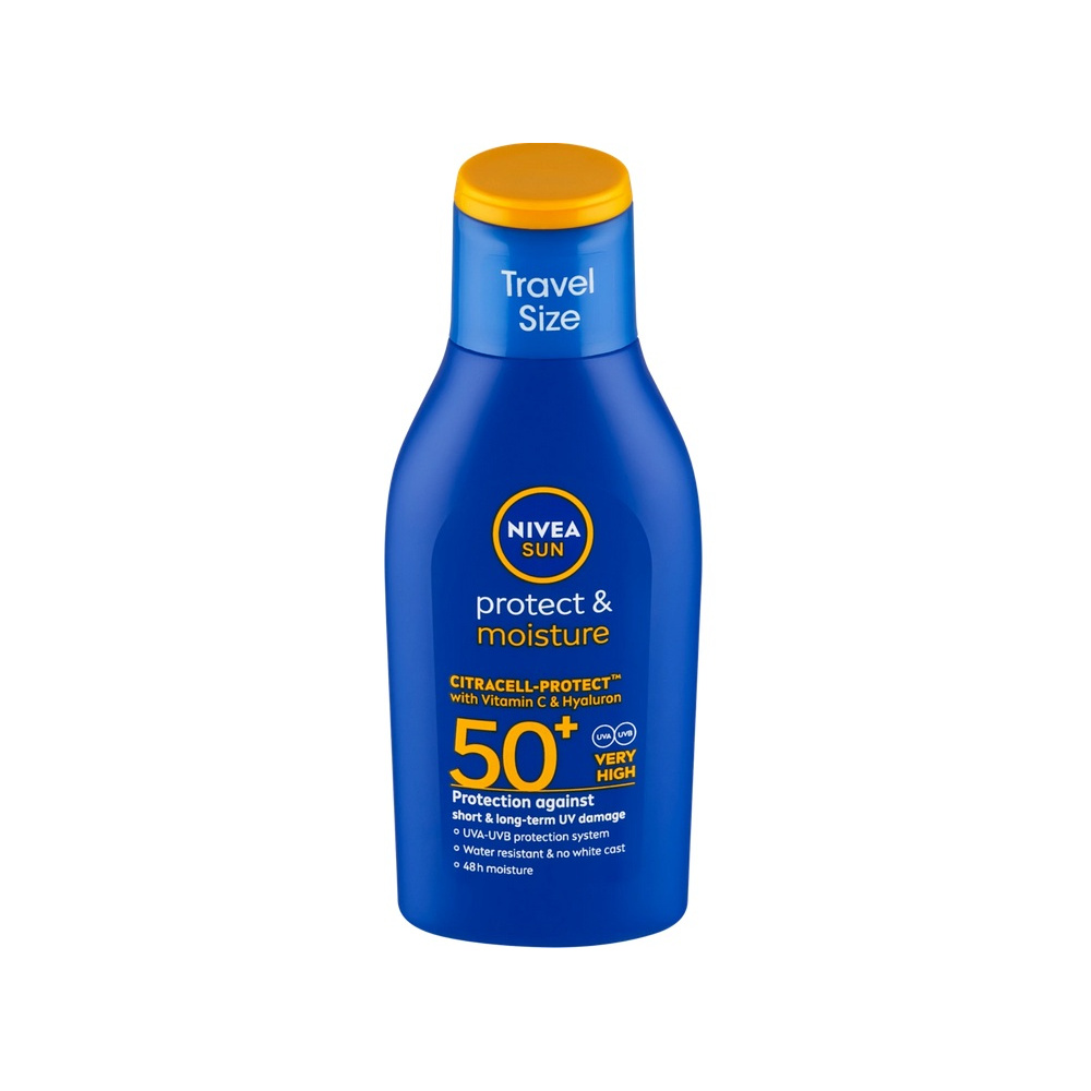 Hydratační tělové mléko Nivea Sun Protect & Moisture s velmi vysokým ochranným faktorem SPF 50+ chrání pokožku před škodlivým UVA i UVB zářením.