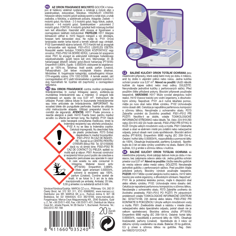 Balené kuličky Orion totální ochrana jsou insekticidní přípravky, které zabíjí šatní moly po dobu 4 měsíců, aniž by došlo k ušpinění oděvů nebo rukou. Jedna kulička ochrání prostor cca 0,07 m³.