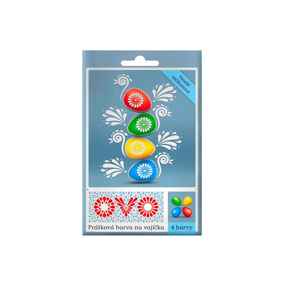 4 práškové barvy určené na barvení velikonočních vajec. Snadná a rychlá aplikace, výrazné barvy.