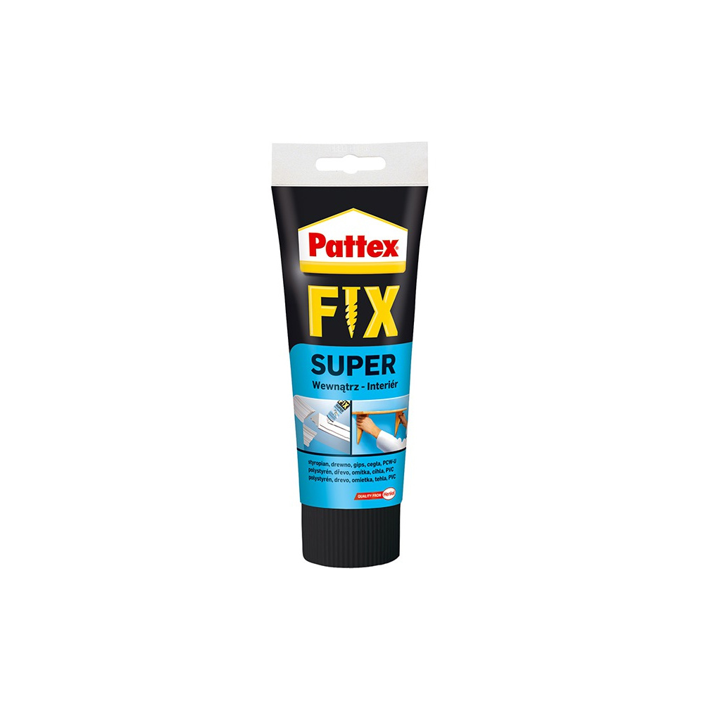Pattex FIX Super je montážní lepidlo k lepení porézních materiálů pro použití v interiéru. Lepí lehké a savé materiály, např. dekorativní desky, polystyrenové prvky, dřevěné desky a zárubně apod.