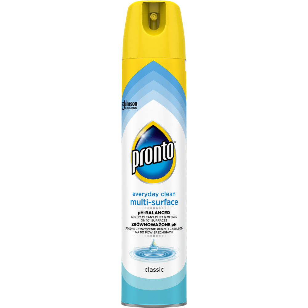 Pronto Multi Surface dokonale odstraňuje prach, šmouhy a otisky. Obsahuje antistatické složky, které zabraňují opětovnému usazování prachu.