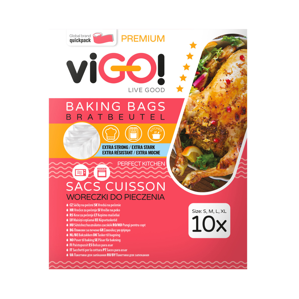 Sada deseti pečicích sáčků ViGO! různých velikostí je ideální pro použití v elektrické i horkovzdušné troubě.