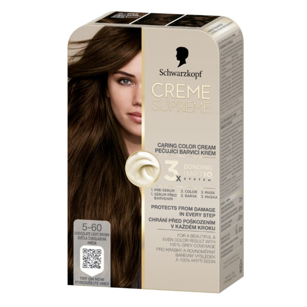 Schwarzkopf Creme Supreme 5-60 Světlá čokoládová hnědá je luxusní krémová barva na vlasy, která nabízí intenzivní, dlouhotrvající odstín s přirozeným čokoládovým tónem.