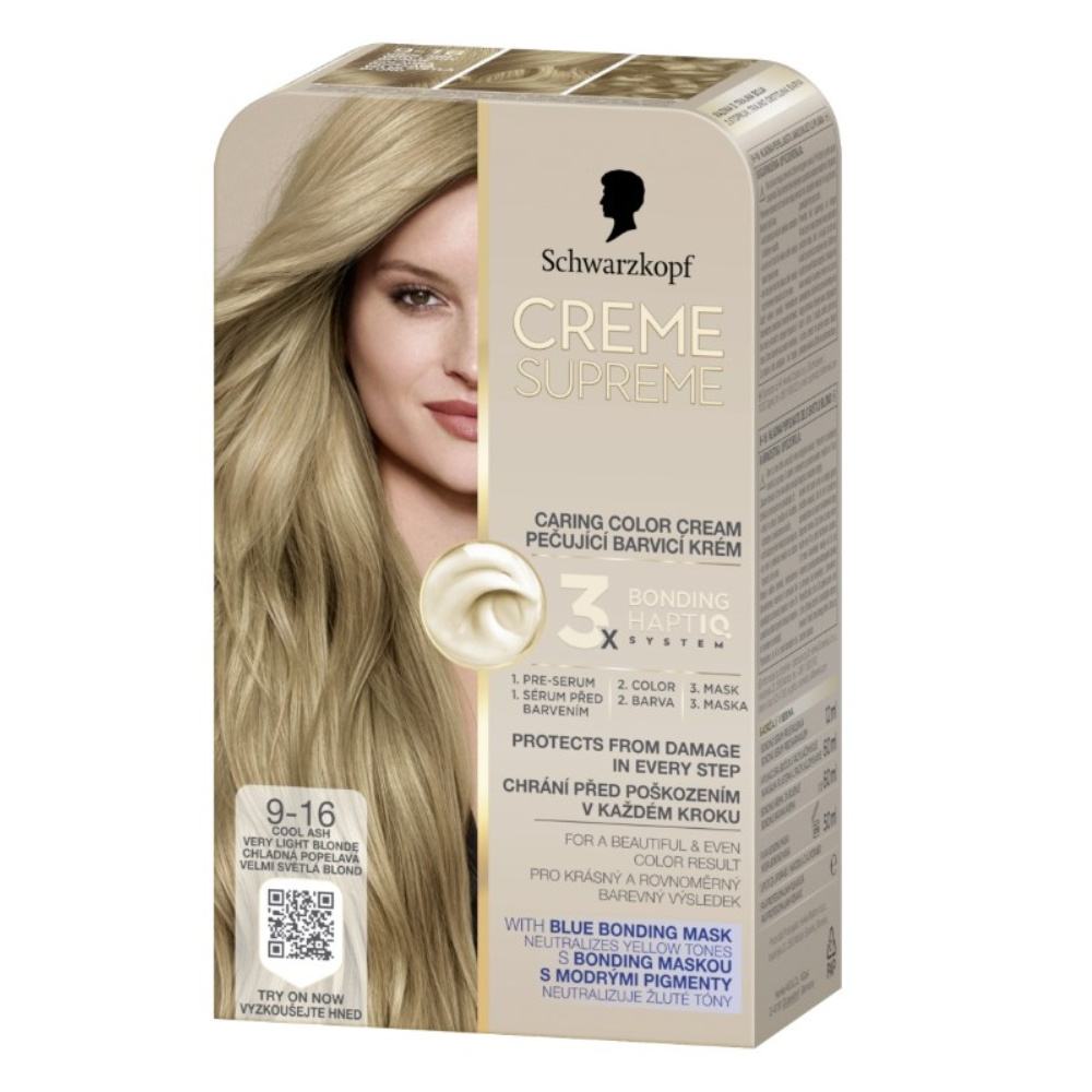 Permanentní barva na vlasy Schwarzkopf Creme Supreme 9-16 dodává vlasům elegantní, chladný popelavý odstín velmi světlé blond.