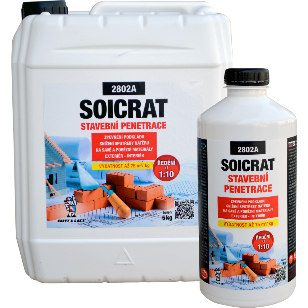Univerzální penetrační nátěr na savé podklady (omítka, beton, dřevo atd.) pro snížení savosti a zároveň zlepšení přilnavosti vrchního nátěru disperzní barvou (Latex, Bakrylex email, Barlet akrylát, Bakrylex lak). Rovněž zlepšuje vlastnosti malt a betonů. Soicrat stavební penetrace se nanáší na suchý, prachu a nečistot zbavený podklad v jedné nebo ve dvou vrstvách (dle savosti podkladu). Vrchní nátěr barvou je možno aplikovat po zaschnutí penetrační vrstvy. V závislosti na savosti a na stavu zpevňovaného podkladu je možné ředit v poměru 1 díl penetrace a 3 až 10 dílů vody.