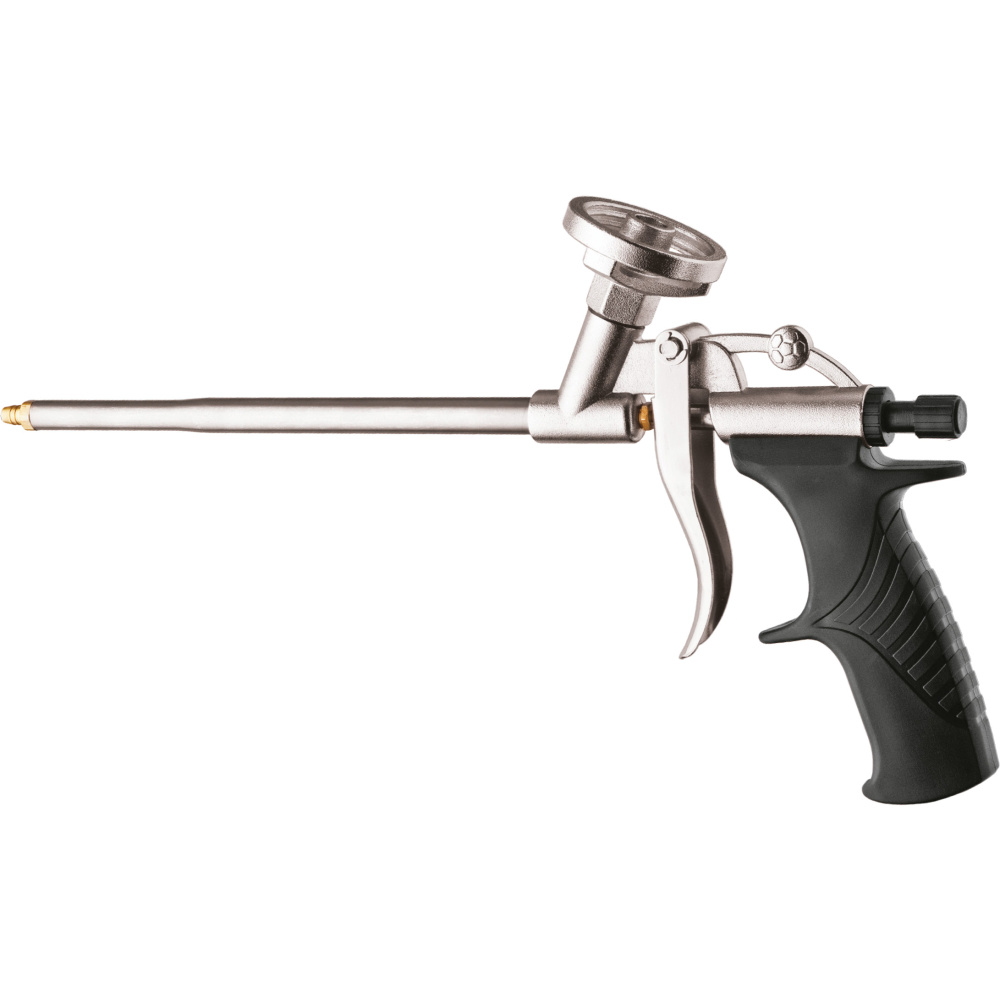 Lehká kovová pistole pro aplikaci všech běžných typů pistolových pěn. Je vybavena precizním regulačním mechanismem pro komfortní a přesné dávkování montážní pěny.