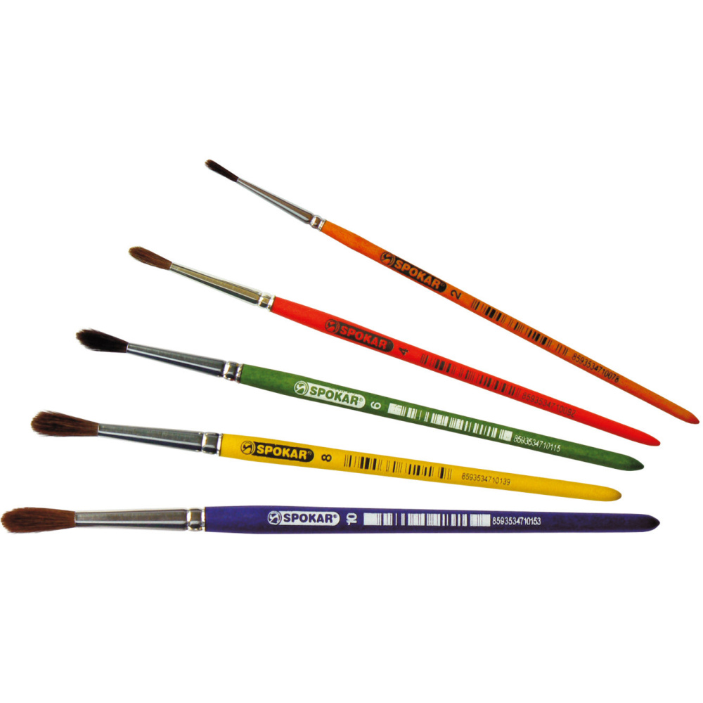 Kvalitní školní štětec SPOKAR, kulatý, má dřevěné lakované držadlo, jemná živočišná vlákna, viditelná délka vláken 11 mm, velikost číslo 2.