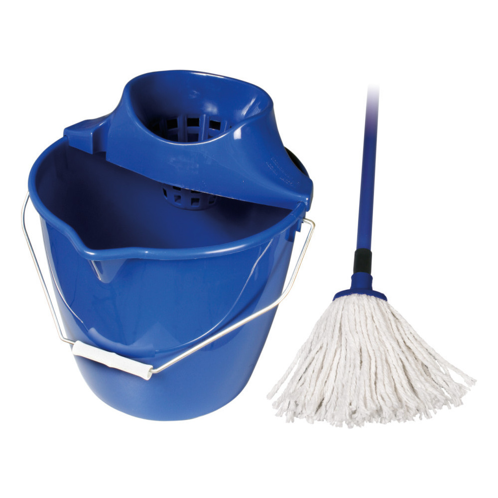 Úklidová souprava SPOKAR obsahuje kbelík kulatý 10 litrů, ždímač, kovovou hůl, mop bavlněný.