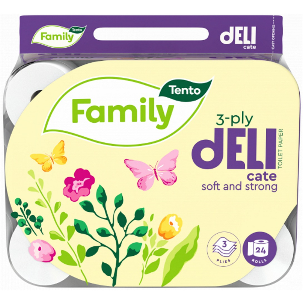 Jemný a zároveň pevný toaletní papír Tento Family Delicate je ideální pro každodenní použití celé rodiny. Díky 3 vrstvám poskytuje vysoký komfort a spolehlivost, přičemž zůstává příjemně měkký k pokožce.