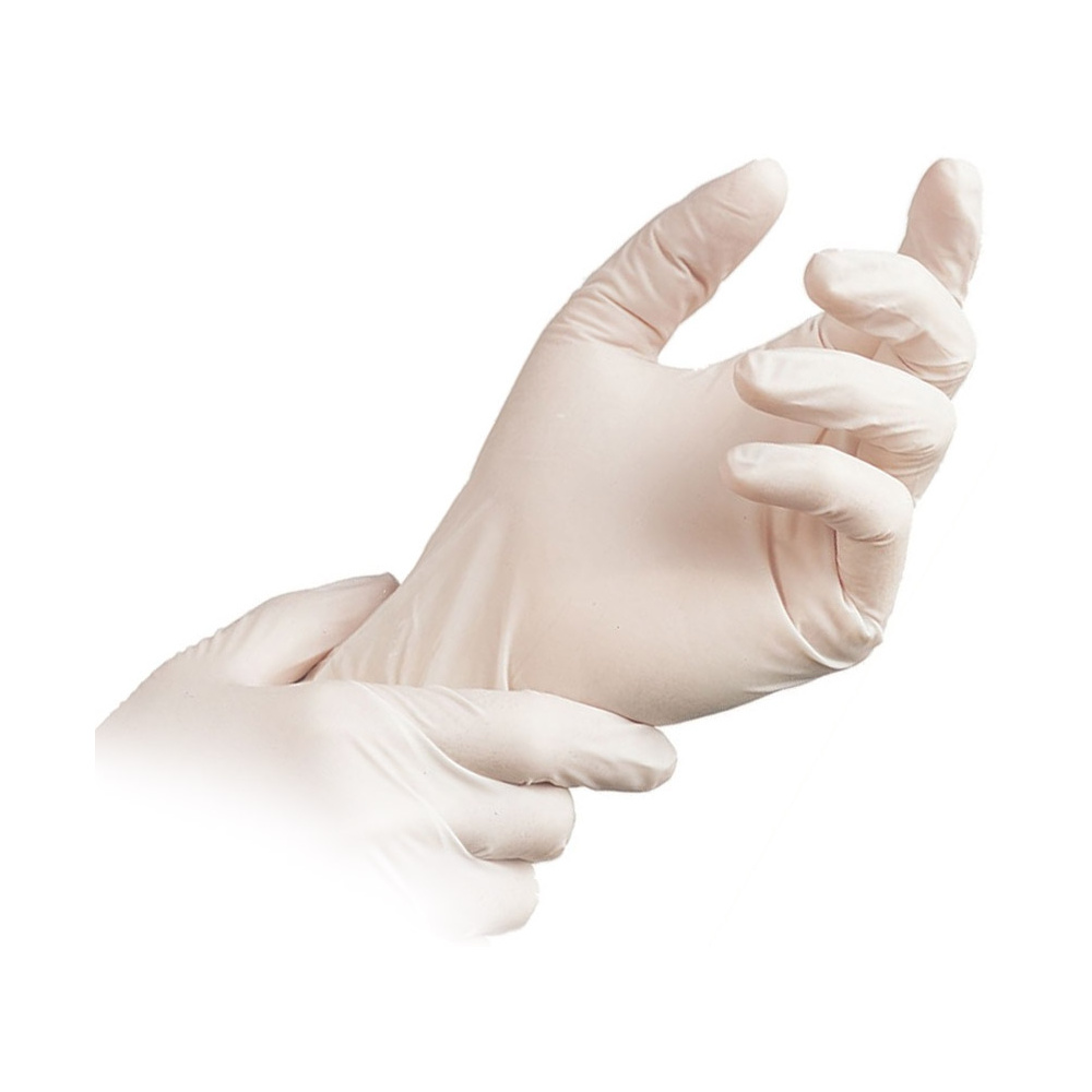 Latexové jednorázové lehce zaprášené rukavice velikosti L. Jsou vysoce pružné, vyrobené z přírodního latexu. Jsou nesterilní.