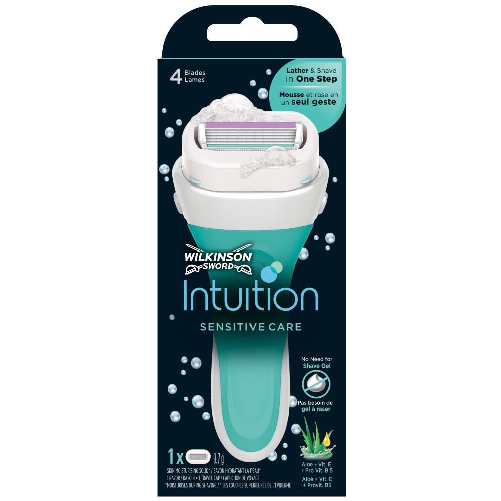 Wilkinson Sword Intuition Sensitive Care holicí strojek je vybaven čtyřmi břity, které jsou obklopené mýdlovým kondicionérem. Tento kondicionér obsahuje hypoalergenní mléko s 100% přírodním výtažkem z aloe vera a vitamínem E.